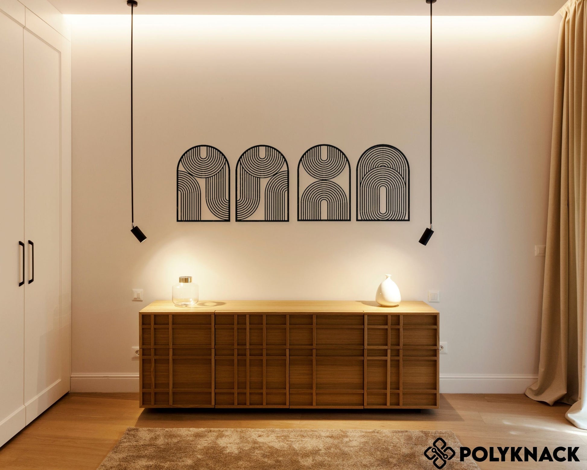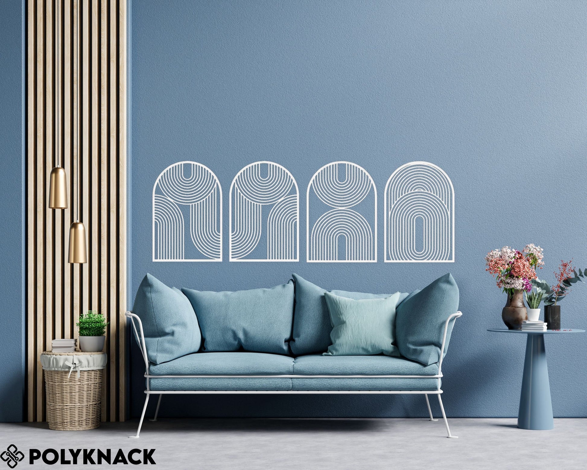 Bring bold, modern charm to your space with this four-panel Mid Century Modern wall art. Featuring clean Bauhaus-inspired lines and boho curves, this minimalist design makes a stunning statement above a couch, bed, or in an entryway. Crafted from laser-cut wood, it's perfect for adding geometric elegance and visual interest to any room in your home.